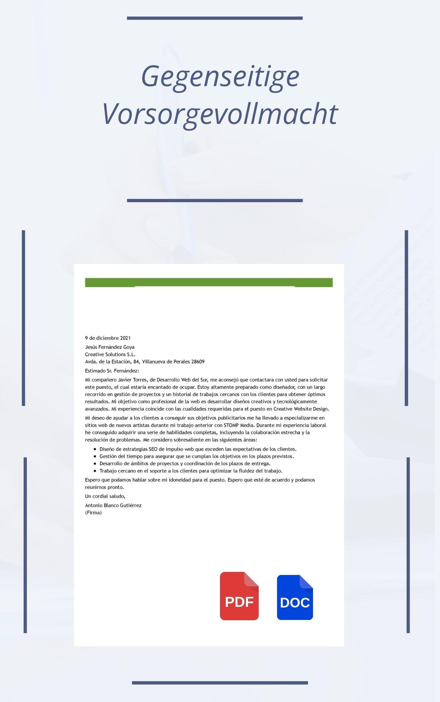 Um eine gegenseitige Vorsorgevollmacht zu schreiben, sollten Sie die Informationen über Ihre Vertrauenspersonen, die Entscheidungsbereiche und die gewünschten Regelungen zusammenstellen. Beachten Sie, dass das Dokument bestimmte formale Anforderungen erfüllen muss, wie z.B. eine notarielle Beurkundung.